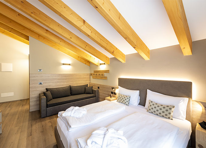 In unserer Unterkunft im Fassatal haben Sie die Wahl zwischen zwei Zimmerkategorien, allesamt geräumig, mit Sorgfalt eingerichtet und mit Balkon oder Terrasse versehen.